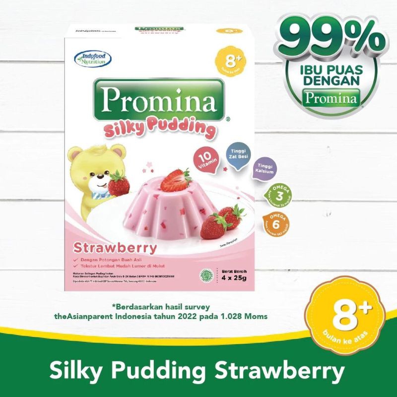 Promina Puding Stroberi terbuat dari perpaduan susu full cream berkualitas dan tanpa bahan pengawet. Kandungan : - Fortifikasi 11 vitamin untuk membantu pertumbuhan dan perkembangan optimal - Kolin membantu pertumbuhan otak - Tinggi serat dengan inulin membantu sistim pencernaan - Vitamin D membantu pertumbuhan tulang dan gigi - Umur simpan 12 bulan