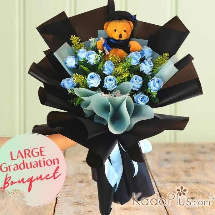 Buket Bunga Graduation berukuran Besar (Large), buket wisuda dengan bunga-bunga artifisial (silk flower) yaitu: 10 bunga mawar, filler, dan daun daun, dibungkus black wrapper. DAN dilengkapi dengan boneka bear berukuran 5 inch (sudah termasuk), dan dapat ditambahkan hiasan kayu "Congrats Grad" (dengan tambahan harga) atau nama dari peneiram buket Max 10 alphabet (dengan tambahan harga) .