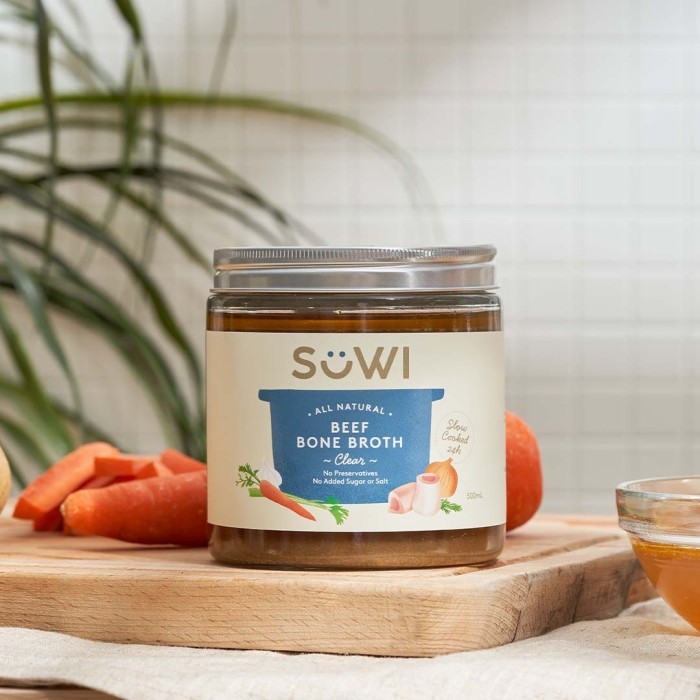 1. 500 ml. Glass jar. 2. Made using organic vegetables + grass-fed beef bones. No artificial flavours, no salt and absolutely no preservatives were used in our broths. 3. PALEO + KETO FRIENDLY. No soy, no sugar, no dairy and 100% HALAL. 4. Perfect for baby’s first foods or MPASI. Perfect for drinking as its own or for cooking. 5. Blanched + roasted + slow cooked for 24 hours, keeping the bones and broths extra clean with NO rancid fats. 6. All of our glass jar have been washed and sterilized before our packaging process. 7. BEST CONSUMED in 3 months when stored in the freezer or 5 days in the fridge. What is bone broth? Bone Broth is made by slow cooking the bones and meats of beef or chicken and connective tissue of animals with organic vegetables. This highly nutritious stock is monly used in soups, sauces and gravies. It has also recently gained popularity as a health drink. This is done through blanching the bones to remove all impurities, coagulated protein and blood, to remove all rancid fats. Then, we roast the bones and vegetables to create a deeper, fuller, richer flavour profile and slow cook the broth for 24 hours to create the broth thick, gelatinous, and containing all the natural nutrients. Benefits of Bone Broths: 1. Contains many important vitamins and minerals, e.g. vitamin A, K2, zinc, iron, boron, manganese and selenium, omega-3 and omega-6 fatty acids. Provides you glucosamine and chondroitin for JOINT HEALTH, calcium, magnesium, potassium, phosphorus, all these minerals for strengthening your bones. 2. Contains collagen and amino acids for SKIN HEALTH. 3. Benefit your GUT HEALTH and DESTIVE SYSTEMS. Protects intestinal wall and “leaky guts” and to process your food more easily. 4. Helps and provides IMMUNE HEALTH. 5. Helps fight INFLAMMATION and AUTO-IMMUNE DISEASES. 6. Helps WEHT LOSS. Allows you to feel “fuller” and suppresses hunger after drinking broth. 7. Improves SLEEP QUALITY + BRAIN FUNCTION.