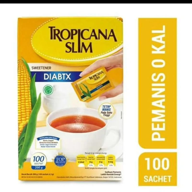Tambahkan 1-2 sachet Tropicana Slim Sweetener DIABTX sebagai pengganti gula pasir, dalam minuman Anda. 1 sachet (2 gram) Tropicana Slim Diabtx setara dengan 2 sendok teh (10 gram) gula pasir.