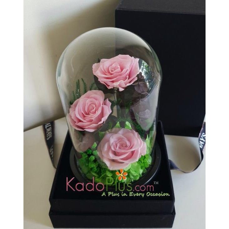Preserved 3 Pink Rose tahan lama dalam glass container.