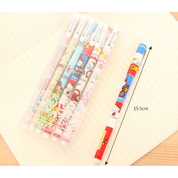 Pulpen Gel Set Hello Kitty ini dalam 1 set terdiri dari 6 buah pulpen Gel tinta Hitam. Mata pulpen 0.38mm. Panjang pulpen kira-kira 15,5 cm.