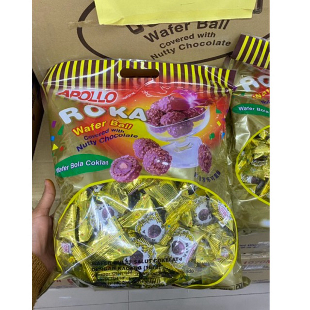 snack wafer renyah berbentuk bola berisi coklat dan juga berbalut coklat kacang. Roka wafer ball menjadi snack favorit dihari spesial.