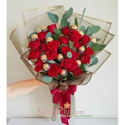 24 stems of stunning red roses, 12 Ferrero Chocolates, with vintage greens wrapped in luxurious golden wrappings.