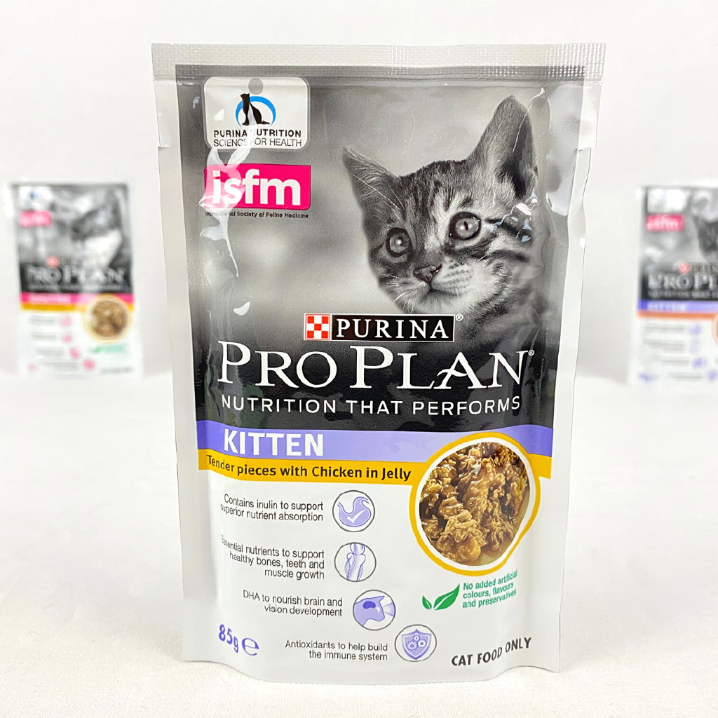 Product descriptionPro Plan Kitten wet cat food is scientifically formulated to be 100% completeand balanced, containing all of the essential nutrients to support your kittenshealthy bones, teeth and muscle growth. Pro Plan Kitten contains DHA to nourishthe brain and vision development as well as antixoidant to help build the immunesystem enabling your kitten the best start at life. It is made with real Chickenin a tasty Jelly for a delicious flavour your Kitten will love.Benefits • Contains inulin to support superior nutrient absorption • Essentialnutrients to support healthy bones, teeth and muscle growth • DHA to nourish thebrain and vision development • Antioxidants to help build the immune systemIngredientsChicken, Lamb and Fish Products; Cereal and Vegetable Products; Minerals,Vitamins and Amino Acids; Soluble Fibre (incl. Inulin); Antioxidants