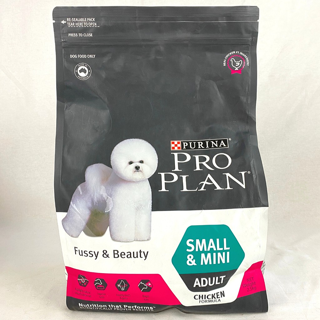 PRO PLAN Small and Mini Adult Fussy and Beauty with OPTIENRICH is a formula superior dry dog food for small and mini size adult dogs. Your smaller dog has higher energy requirements and a smaller stomach, so thats why its important that they receive the right amount of nutrients to keep them healthy and strong._x000D__x000D_With a tasty formula and small easy to chew kibble, Fussy and Beauty with OPTIENRICH helps keep your Small & Mini dog healthy on the inside and out. The concentrated formula, combines key nutrients and antioxidants to enhance the natural pigmentation of the hair, Omega Fatty Acids for lustrous shiny coat, and real chicken to satisfy even the fussiest of eaters._x000D__x000D_Chicken; poultry meal; corn gluten meal; beef and/or lamb tallow preserved with tocopherols (source of vitamin E); ground wheat; brewers rice; ground yellow corn; wheat by-products; soybean meal; calcium carbonate; salt; potassium chloride; vitamin E supplement; fish meal; choline chloride; zinc sulphate; iron sulphate; ascorbic acid (source of vitamin C); natural antioxidants; niacin; manganous oxide; copper sulphate; pantothenic acid; riboflavin supplement; vitamin A supplement; thiamine mononitrate; sodium selenite; pyridoxine hydrochloride; vitamin B12 supplement; menadione sodium bisulphate complex (source of vitamin K activity); folic acid; vitamin D3 supplement; potassium iodide; biotin; natural flavours; whole egg._x000D__x000D_KEY NUTRIENTSUnitValue_x000D_Protein%32_x000D_Fat%18_x000D_Fibre (Max)%3_x000D_Salt (Max)%1.8_x000D_Omega 6 Fatty (Min)%1.5_x000D_Metabolizable Energy (ME)kcal/g3.78