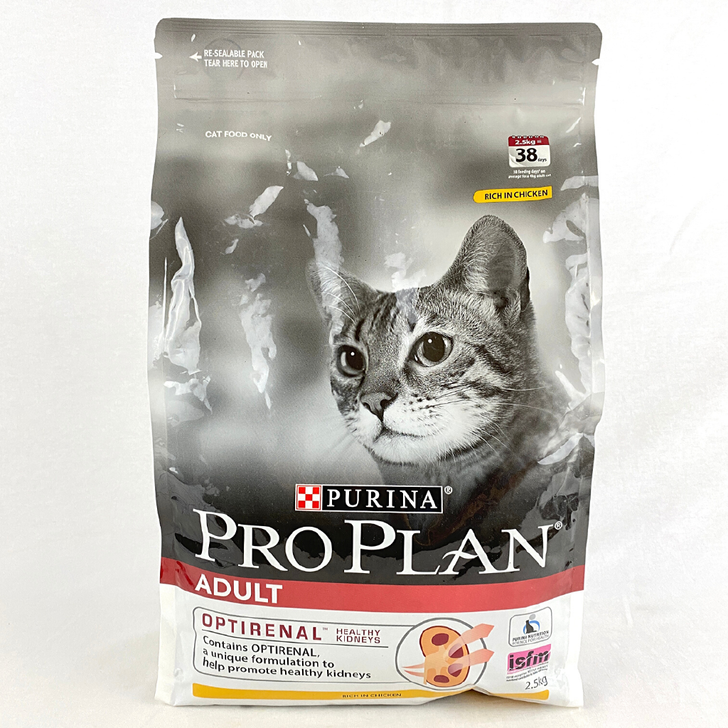 PRO PLAN Adult Chicken with OPTIRENAL is a unique formulation rich in chicken,to help promote healthy kidneys in your cat.Did you know that kidney disease is very common in cats, and problems withkidney health can begin early in adulthood and can eventually becomeirreversible?OPTIRENAL blend is formulated to help protect the kidneys from oxidative damageand helps reduce inflammation so your cat can live a healthy life.Chicken (dehydrated chicken, chicken); whole grain wheat; corn protein; animalfat preserved with mixed-tocopherols (form of vitamin E); dehydrated fish;minerals, vitamins, amino acids, organic acids and natural flavours (includingcalcium, phosphorous, sodium, chloride, potassium, magnesium, manganese, copper,zinc, iron, iodine, selenium, vitamin A, vitamin B1, vitamin B2, vitamin B3,folic acid, vitamin B5, vitamin B6, vitamin B12, vitamin C, vitamin D, vitaminE, choline, pyrophosphates, arginine, beta-carotene); chicory; legume protein;fish and/or vegetable oils; oats and barley; natural antioxidants.KEY NUTRIENTSUnitValueProtein (Min)%36Fat (Min)%16Fibre (Max)%3Salt(Max)%2.0Vitamin A (Min)IU/kg10,000Vitamin E (Min)IU/kg540Vitamin C(Min)mg/kg70Omega 3 Fatty Acids (Min)%0.7Omega 6 Fatty Acids(Min)%1.0Metabolizable Energy (ME)Kcal/kg3.67