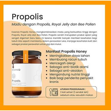 Essenzo Propolis Honey mengkombinasikan madu kualitas tinggi dengan Sari Kurma, Propolis lebah Trigona, Minyak Habbatussaudah dan Vitamin C.