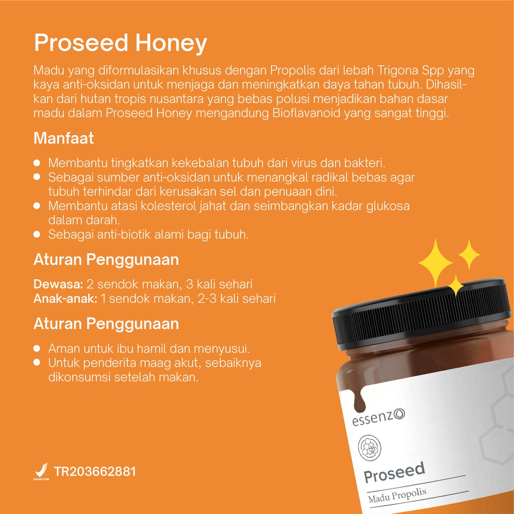 Essenzo Proseed Honey mengkombinasikan madu kualitas tinggi dengan Sari Kurma, Propolis lebah Trigona, Minyak Habbatussaudah dan Vitamin C. Madu Propolis adalah madu yang diformulasikan khusus dengan diperkaya Propolis dari lebah tanpa sengat (Trigona spp Bee) yang mengandung antioksidan tinggi untuk menjaga kesehatan dan meningkatkan daya tahan tubuh. Dihasilkan dari hutan tropis nusantara yang bebas polusi berkualitas karena mengandung potensi bioflavonoid yang sangat tinggi. Madu Propolis terbuat dari berbagai bahan pilihan berkualitas meliputi madu hutan, sari kurma, propolis Trigona, dan minyak Habbatussaudah yang mengandung berbagai senyawa bioaktif, vitamin dan mineral yang dibutuhkan oleh tubuh