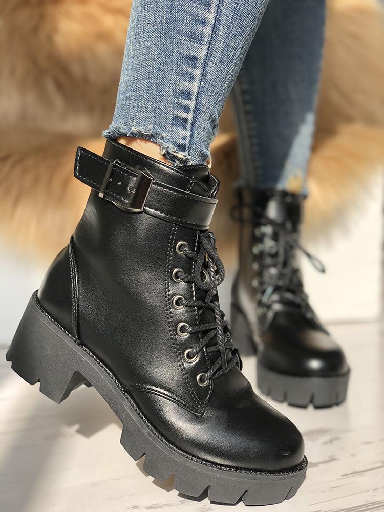PU Lace-Up Platform Chunky Heeled Boot, Black