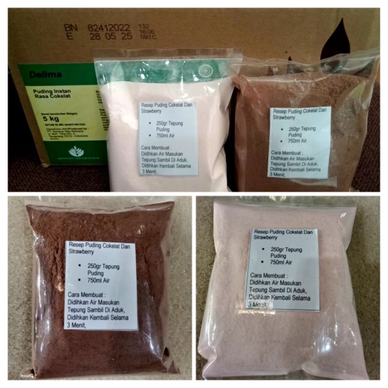 Pudding instan delima adalah pudding yang sudah siap di olah , dalam artian tanpa di tambahkan gula dan bahan lainya, kalian cukup menambahkan air saja sebanyak 750 ml untuk 250 gram tepung puding.