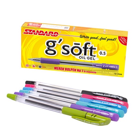 Standard Pen G'Soft 0.5 yang berbentuk Stick Pen, dengan Tinta Oil Gel, Tip Point 0.5 dilengkapi dengan Body warna warni cantik pada bagian Clip, End Plug, Rubber (Karet yang mudah digenggam dan nyaman untuk menulis), Tinta tersedia dengan warna Hitam (Body Bolpen Warna-Warni)