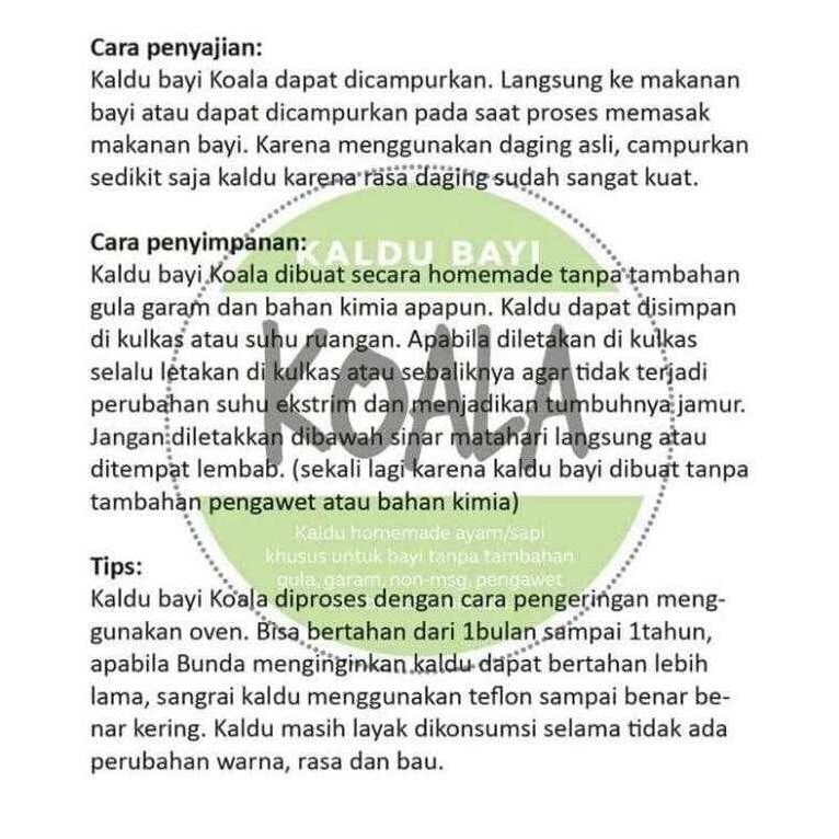 Kaldu bayi Koala adalah kaldu homemade yang dibuat untuk menunjang menu MPASI si kecil. Terbuat dari 50% daging ayam atau sapi tanpa tulang dan lemak, serta 50% sayuran dan rempah. Tidak menggunakan gula, garam dan bahan kimia apapun.
