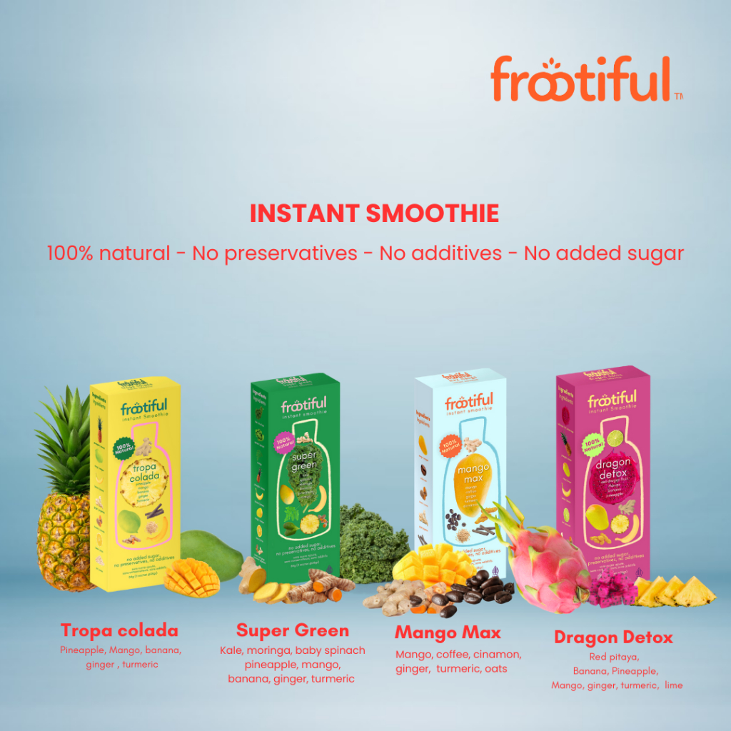 Frootiful Smoothie mix adalah smoothies powder instan yang terbuat dari buah-buahan dan rempah-rempah asli, 100% natural, tanpa tambahan gula dan bahan kimia apapun.