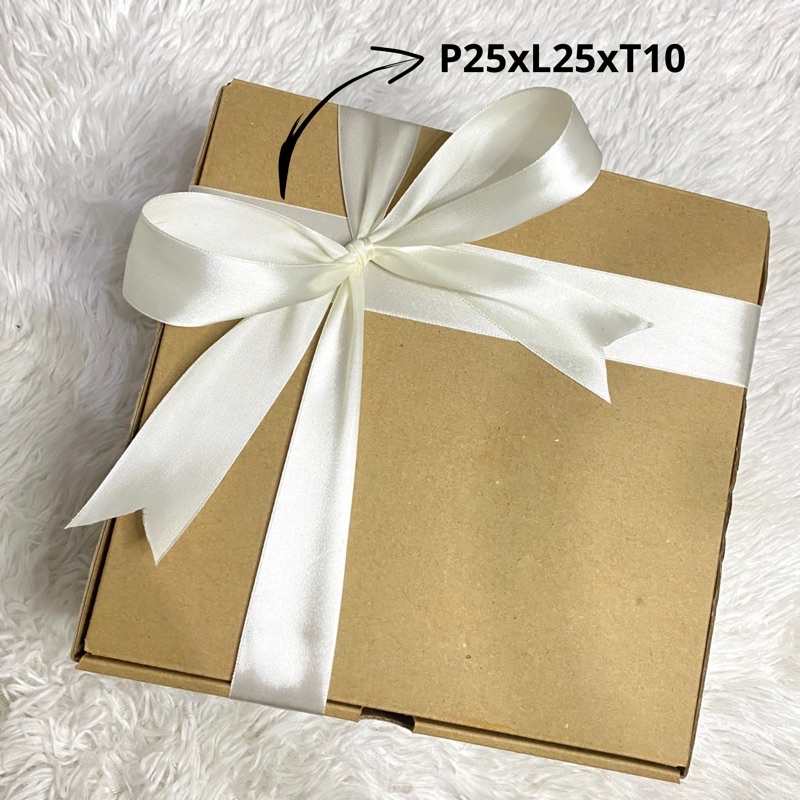 Kardus ukuran P25xL25xT10. ditali dengan pita besar berwarna broken white membuat hampers terlihat elegan