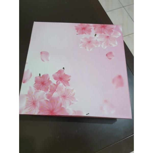 Box kue yang bermotif bunga sakura/dus brownies/ ukuran 20x20x5/harga yang tertera per pcs/warna dalam berwarna putih.