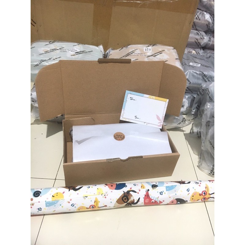 Dus packing + Kertas putih pembungkus tas di dalam + Stiker + Kartu ucapan ( request yang mau di tulis apa saja ) + Kertas Kado