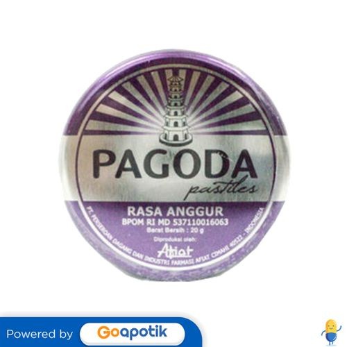 Deskripsi: Pagoda pastiles anggur merupakan permen rasa anggur berbetuk tablet hisap untuk menyegarkan nafas dan melegakkan tenggorokan | Komposisi: Sukrosa, dekstrin, gelatin sapi, laktosa, pati jagung, glukosa, perisa stroberi, polietile glikol 4000, perisa mint, pengatur keasaman asam sitrat, pemanis buatan (aspartam 0,062 % : ADI 50 mg/kg BB, asesulfam-K 0,079 % : ADI 15 mg/ kg BB), pengawet natrium | Dosis: Gunakan sesuai kebutuhan. | Indikasi: Pagoda pastiles anggur merupakan permen rasa anggur berbetuk tablet hisap untuk menyegarkan nafas dan melegakkan tenggorokan | Perhatian Khusus: | Kemasan: Kaleng, 20 gr | NIE: MD 524410012321