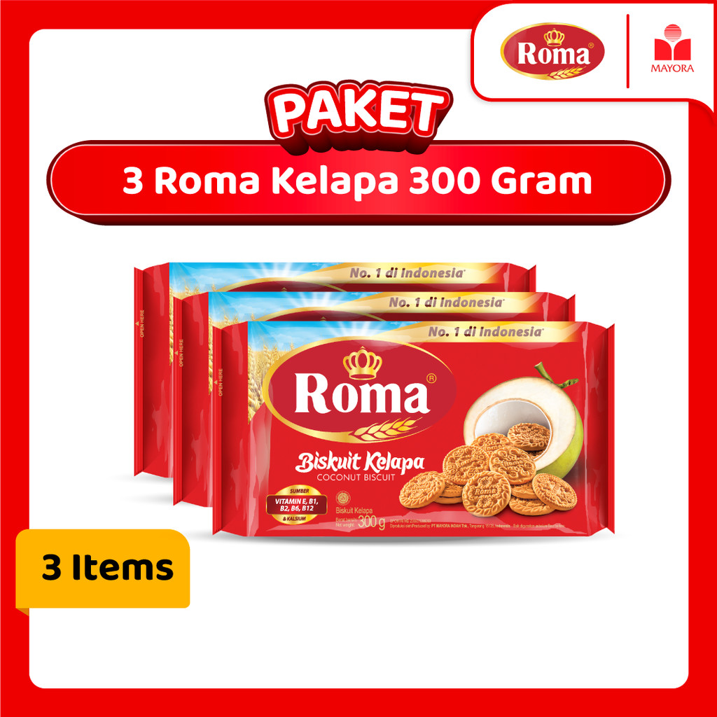 Roma Kelapa 300 gram adalah Biskuit yang terkenal dengan rasa gurih kelapa dan teksturnya yang renyah. Roma Kelapa 300 gram juga diperkaya dengan kalsium dan vitamin B1, B2, B6, B12, serta vitamin E. Biskuit ini cocok dinikmati sebagai teman minum teh atau kopi, atau sebagai camilan kapan saja.