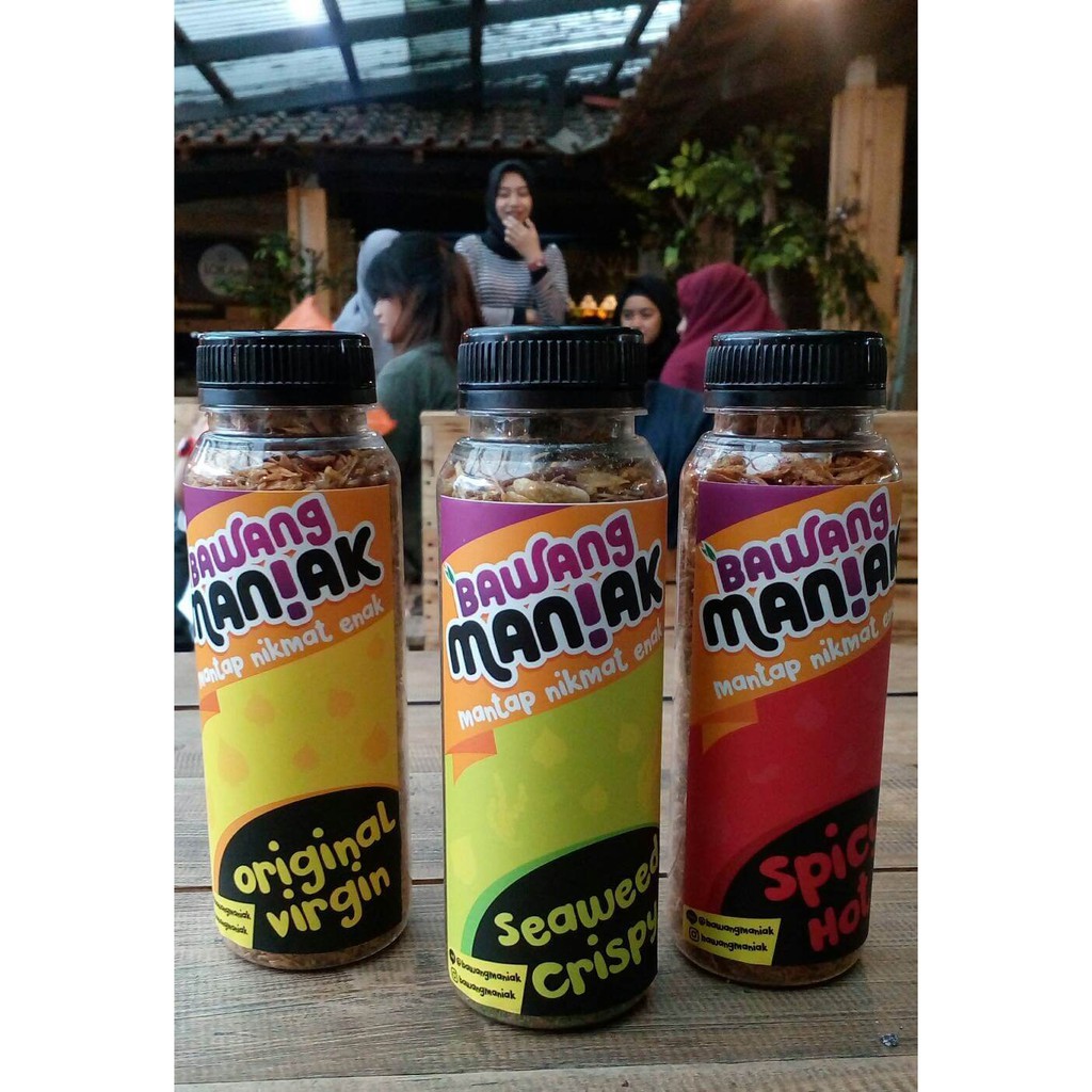 Paket Bawang Maniak 3 Rasa (Original, Pedas, dan Rumput Laut)Bawang goreng premium rasa ngangenin. Bawang siap saji paling enak yang pernah ada! Yang gak suka bawang pun pasti suka deh.Salah satu masterpiece produk kuliner asal Bandung.Apa yang membuat bawang maniak ngehits?- Dibuat homemade tanpa msg apalagi pengawet.- Tanpa campuran tepung.- Renyah, gurih, kriuk.- Kemasan memudahkan untuk dibawa bawa.- Kemasan juga menarik dan kekinian.- Dijamin jika anda posting di instagram akan banyak yang nanya.- Bisa dicemil. Berasa makan ciki kalau udah dicemilBawang maniak biasa digunakan untuk menemani nasi, mie, sop, soto, dan sebagainya..Buat pecinta bawang, bawang maniak wajib ada di tas kamu untuk menemani setiap makanan kamu.Barang selalu ready dan siap kirim!