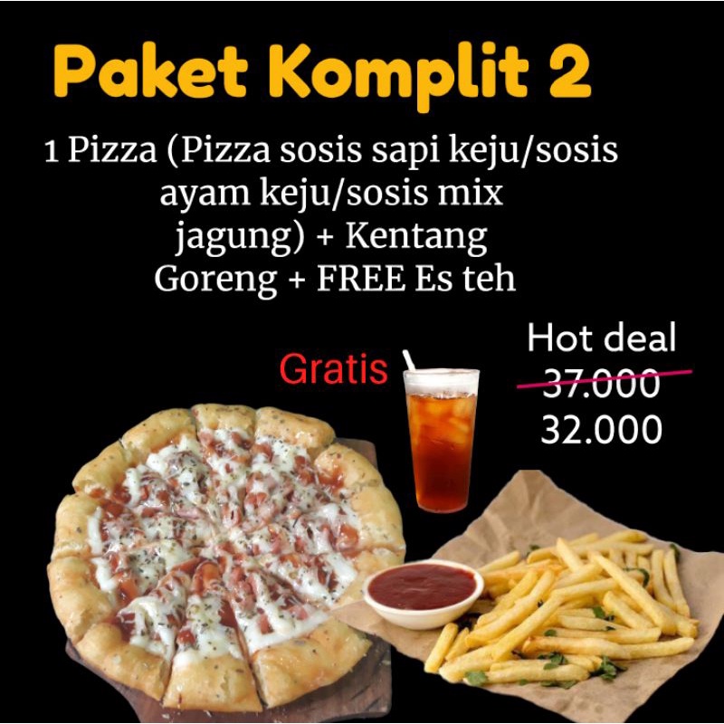 1 pizzaozarella, 1 Porsi kentang goreng, 1 Es teh