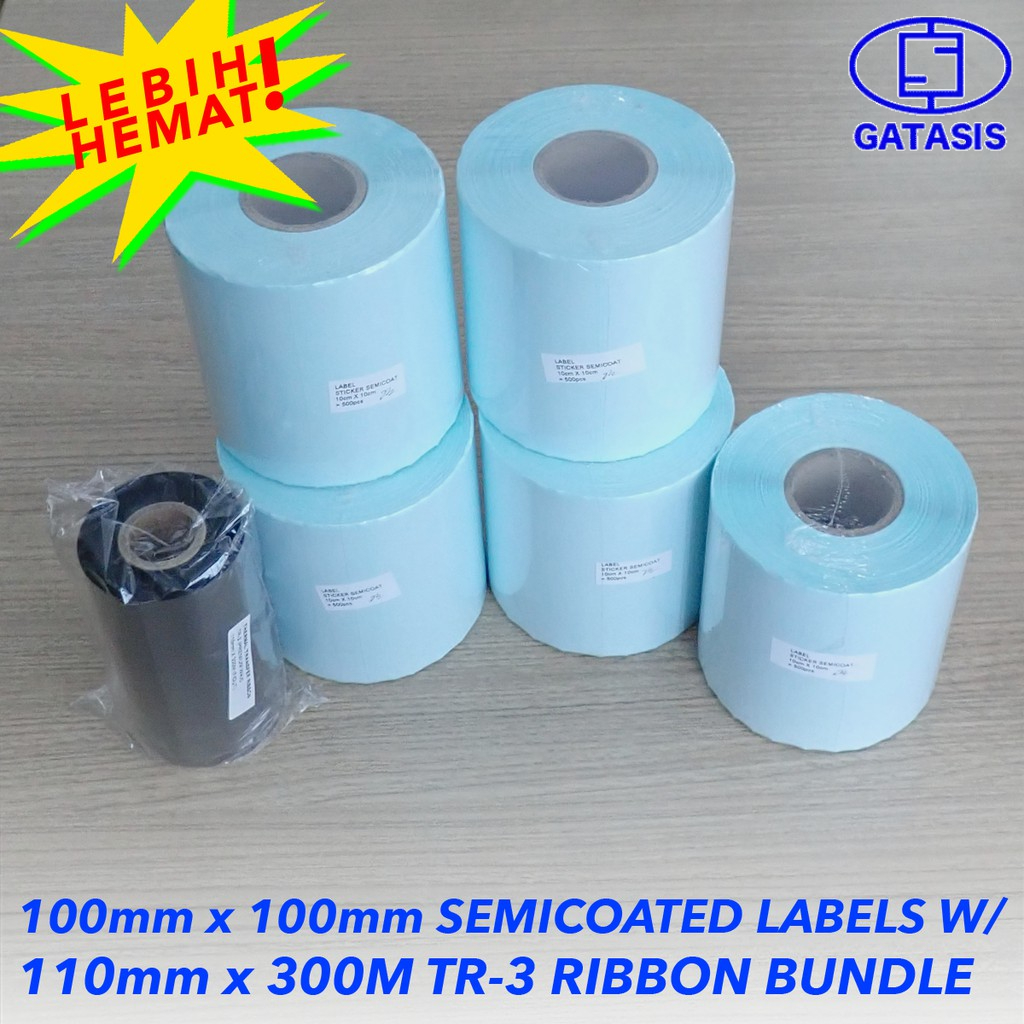 Paket Label Sticker Semi Coated Ukuran 100 mm X 100 mm (1 Roll = 500 pcs) + Ribbon Wax Premium TR-3