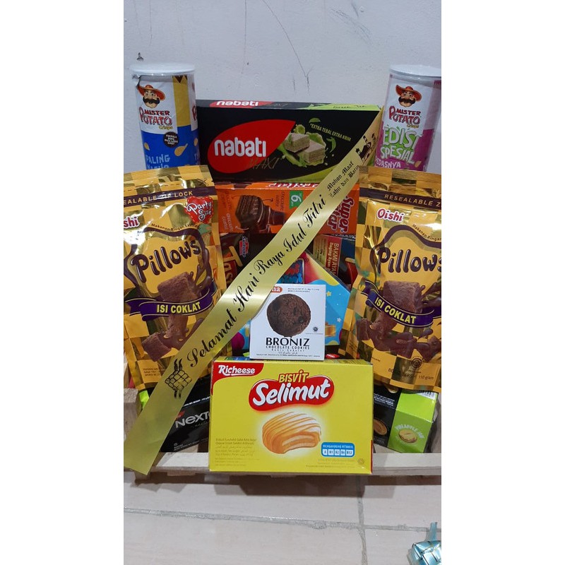 Keranjang + packing + kartu ucapan + aksesoris Idul Fitri