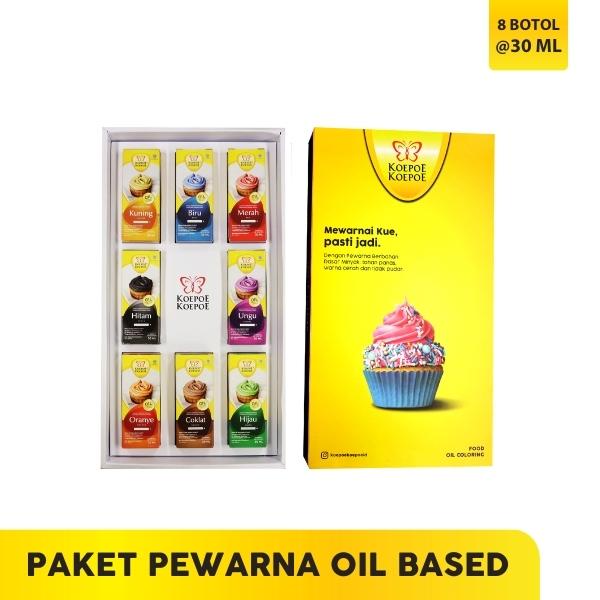Pewarna oil Koepoe Koepoe memiliki 8 varian warna yaitu hitam, merah, hijau, biru, ungu, cokelat, kuning, dan oranye. Kedelapan warna ini siap membuat cake kamu jadi lebih cantik dan #pastijadi.