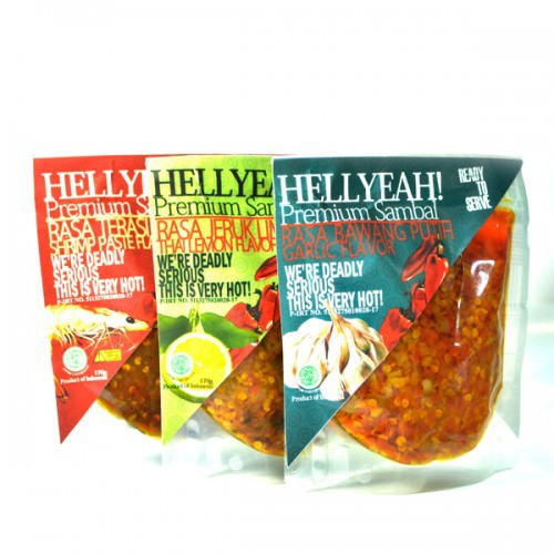 Kabar gembira untuk anda pecinta sambal dengan rasa yang ekstra pedas. Kini hadir Sambal Hellyeah yang pedasnya menggelegar. Dibuat dari cabai rawit merah yang diolah sehingga menghasilkan sambal siap saji dengan rasa pedas yang luar biasa. Selalu siap sedia Sambal Hellyeah dengan varian rasa Sambal Bawang Putih, Sambal Jeruk Limo dan Sambal Terasi Udang untuk menyempurnakan waktu makan anda.