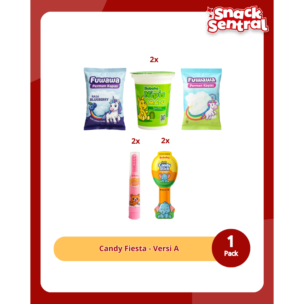 Candy Fiesta Rp10.000 adalah paket snack hemat berisi 5 jajanan manis pilihan dari FuwaWa dan Boboho. Perpaduan permen kapas lembut, candy stick unik, hingga permen asam manis yang menyegarkan. Cocok untuk cemilan anak, bekal sekolah, hadiah kecil, hingga hampers.