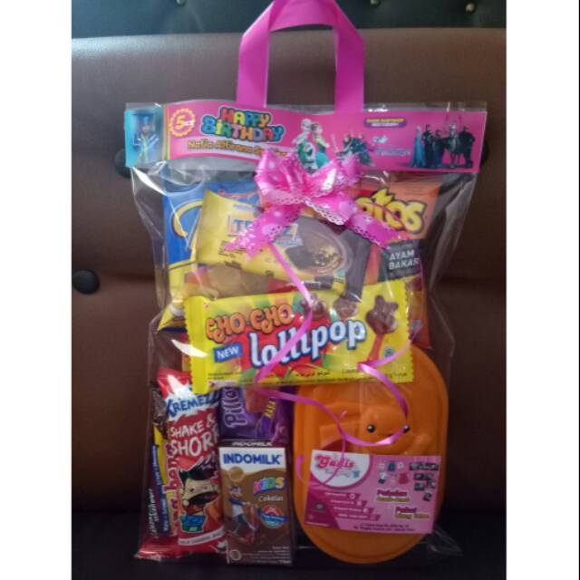 Souvenir tmpat makan + 10 snack di kemas cantik dalam plastik label karakter pake foto anak