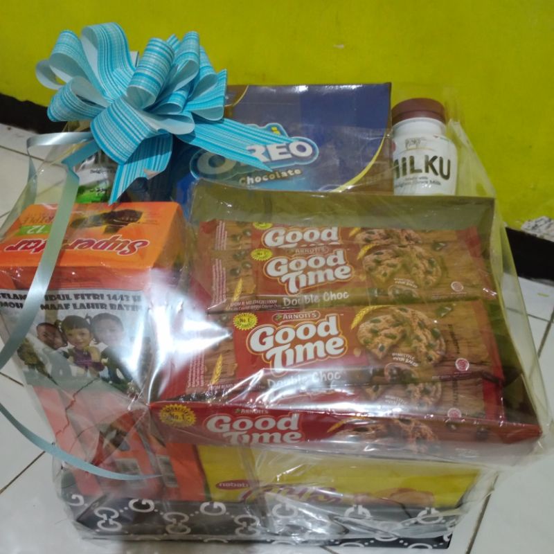 1 paket berisi produk jajanan seharga 500 ribuh beserta kartu ucapan costum