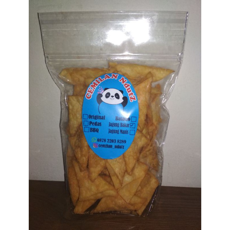 pangsit kering yang di lipat lalu di goreng kering lalu dibumbui dengan bumbui yang melimpah