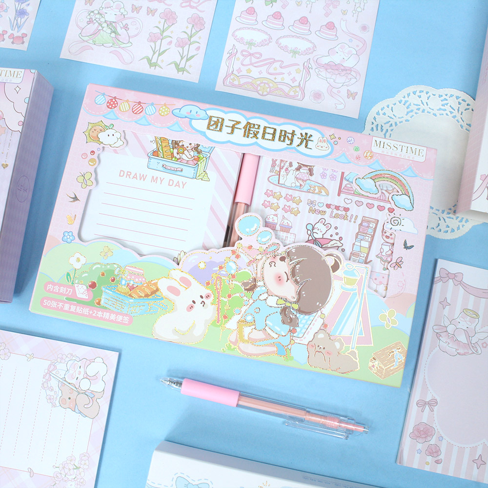 Sebuah pen cutter turut disertakan di dalam box ini, agar kamu dapat dengan mudah mengambil mini stiker yang kamu mau. Selain itu juga terdapat dua notepad yang juga bisa kamu jadikan catatan dan ditempeli stiker.