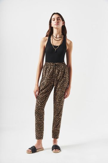 Pantalón de estilo sporty con estampado animal print, elástico y tiras regulables en la cintura. Un must que reversióna el clásico jogging en una prenda mas sofisticada.