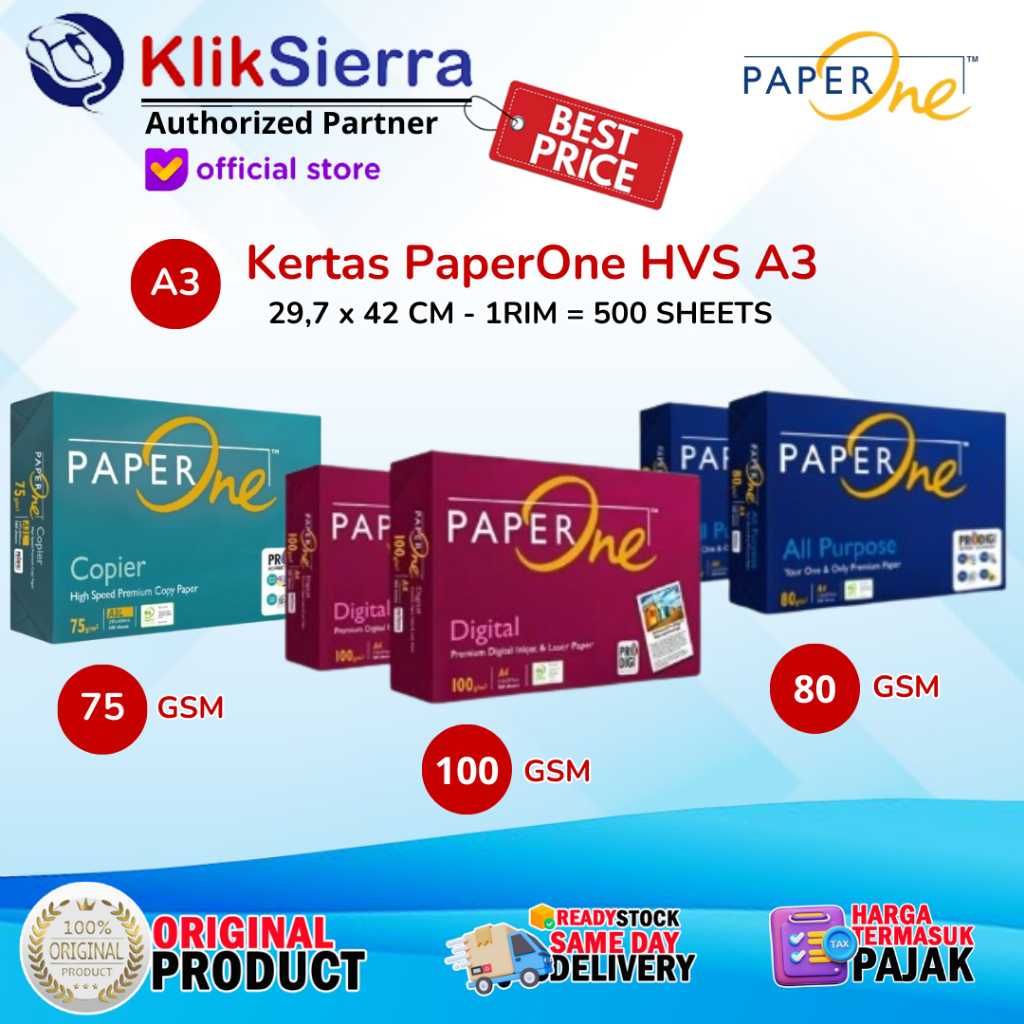 PaperOne Kertas A3 75gr / 80gr / 100gr Copier 1 Rim (500 lembar) Kertas HVS