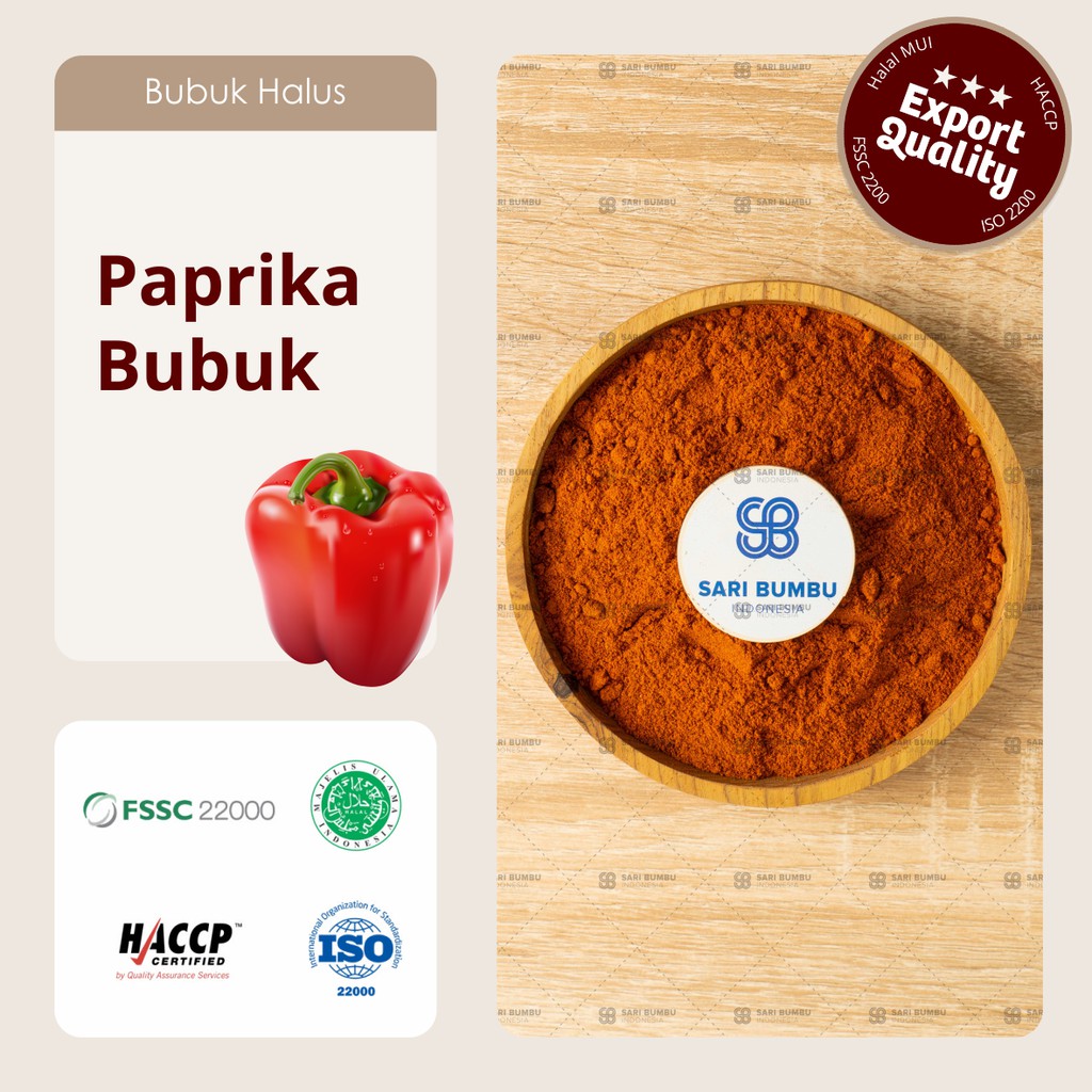 Paprika Bubuk yang di proses dengan sangat higienis dengan standar mutu Internasional. Paprika Bubuk ini murni tanpa campuran dan melewati 3 tahapan pembersihan dengan mesin standar produksi untuk Ekspor ke Jepang. Citara rasa original dengan aroma yang berkelas membuatPaprika Bubuk ini biasa digunakan untuk penggunaan Industri Makanan (Bumbu), Pengemasan ulang retail, Produk F&B, Restaurant, Makanan Cepat Saji, Kafe, Bakery, Penggunaan Rumah tangga.