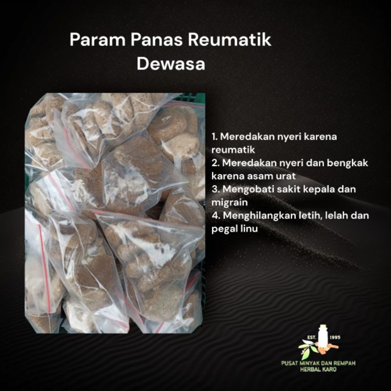 Param ini mampu dan ampuh secara alami mengobati asam urat, reumatik, sakit pinggang, badan pegal linu, sakit kepala, dan masih banyak lainnya..