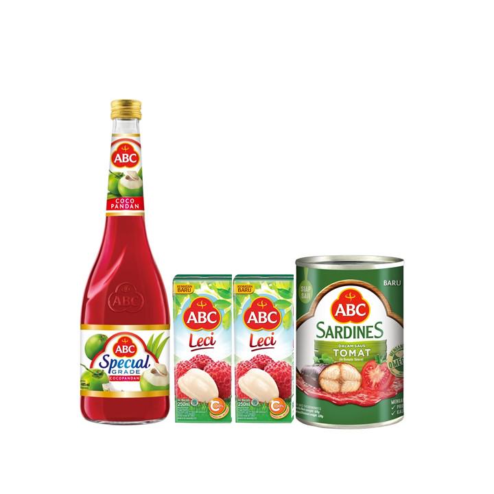 Isi Paket:ABC Sirup Special Grade Cocopandan 485 mL ;ABC Lychee Juice 250 mL;ABC Sarden Saus Tomat 425 g Keluar Makin Dekat Dengan ABC