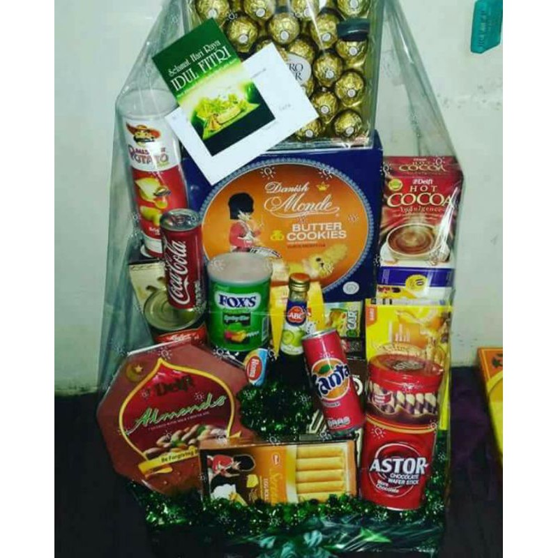 Isian terdiri dari aneka jajanan, kue, snack, cemilan, minuman, dll yang dirangkai cantik