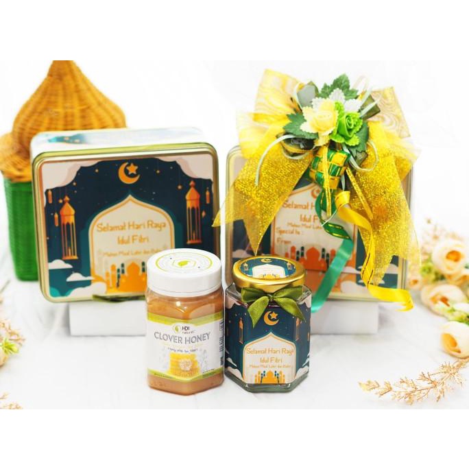 Contains : - 1 pcs Exclusive Eid package with White Tulle - 1 jar Eid Glass Jar Choco Chip , Sagu Keju, Kacang Thailand Kurma, Choco Ball, Green Tea , Noir Cookies in jar. - 1 pcs Clover Honey 0.5 Kg - 1 pcs Eid Mubaraq Card 2023