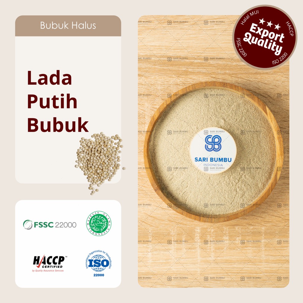 Lada Putih Bubuk yang di proses dengan sangat higienis dengan standar mutu Internasional. Lada Putih Bubuk ini memiliki aroma hangat, membuat citarasa yang lebih pedas dan panas, rasanya sedikit pahit dari lada hitam. Apalagi merica ini menjadi salah satu bumbu dapur yeng antiseptik dan menjadi favorit para ibu rumah tangga. Rasanya yang pedas segar kerap membuat makanan terasa begitu menggugah selera. Biasanya merica atau Lada putih Bubuk digunakan dalam masakan asia seperti ayam goreng, sayur sop, aneka tumis, kari, dan taburan aneka makanan.