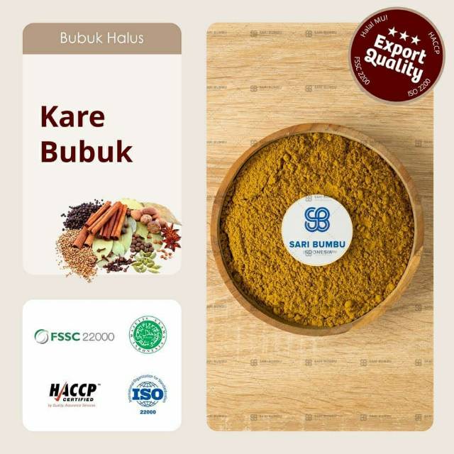 Kare Bubuk yang di proses dengan sangat higienis dengan standar mutu Internasional. Kare Bubuk ini campuran rempah-rempah yang digunakan untuk membuat masakan India dan Kari. Bisa dimasak dengan bahan lainnya seperti Bubuk Bawang Putih, bawang segar, garam, dan santan untuk membuat saus Kare dasar. Melewati 3 tahapan pembersihan dengan mesin standar produksi untuk Ekspor ke Jepang. Citara rasa original dengan aroma yang berkelas.