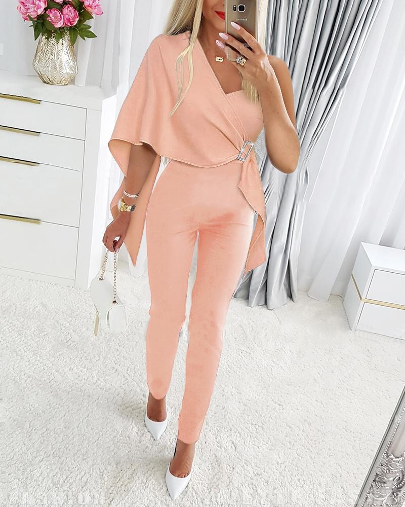 Patchwork Buckle Decor One Shoulder Jumpsuit, Pink