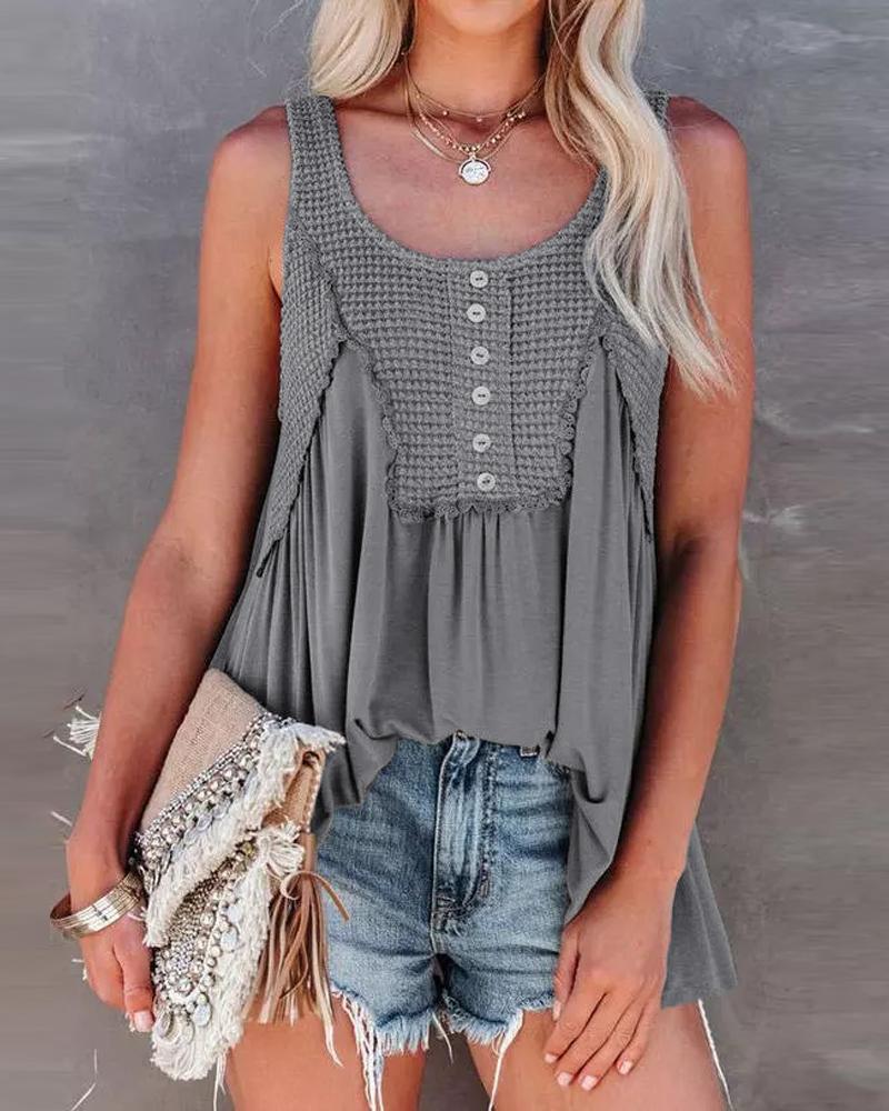Patchwork Button Front Ruched Detail Flowy Tank Top, Gray