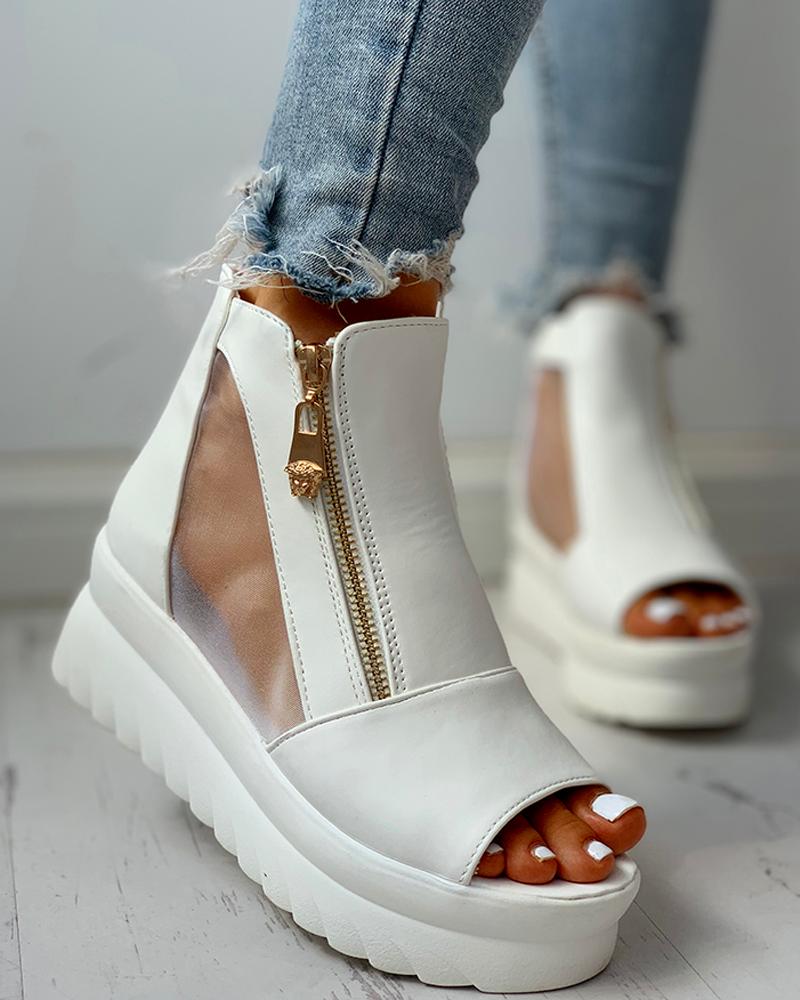 Patchwork Mesh See Through Zipped Design Platform Sandals, White