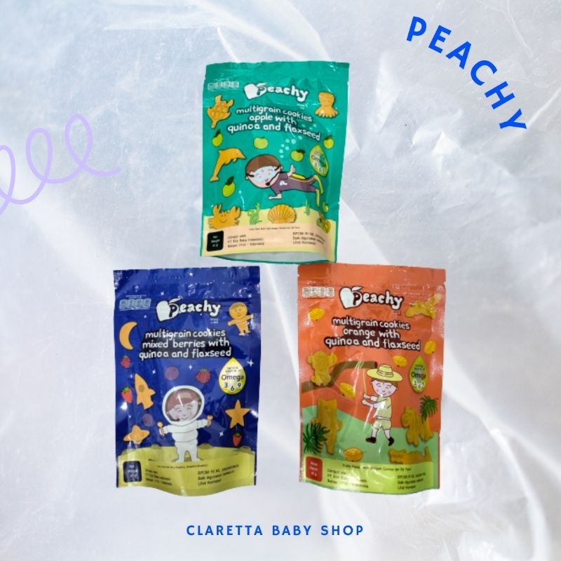 Peachy Multigrain Cookies merupakan camilan sehat dan lezat untuk si Kecil yang dibuat dengan perpaduan Quinoa dan Flaxseed yang kandungan protein nya setara dengan ikan. Dibuat dengan berbagai bentuk yang unik dan memiliki potongan buah-buahan asli di dalam biskuitnya. Bebas dari pewarna, perasa, dan pengawet. Moms tidak perlu repot lagi memilih camilan yang sehat untuk si Kecil sehari-hari.