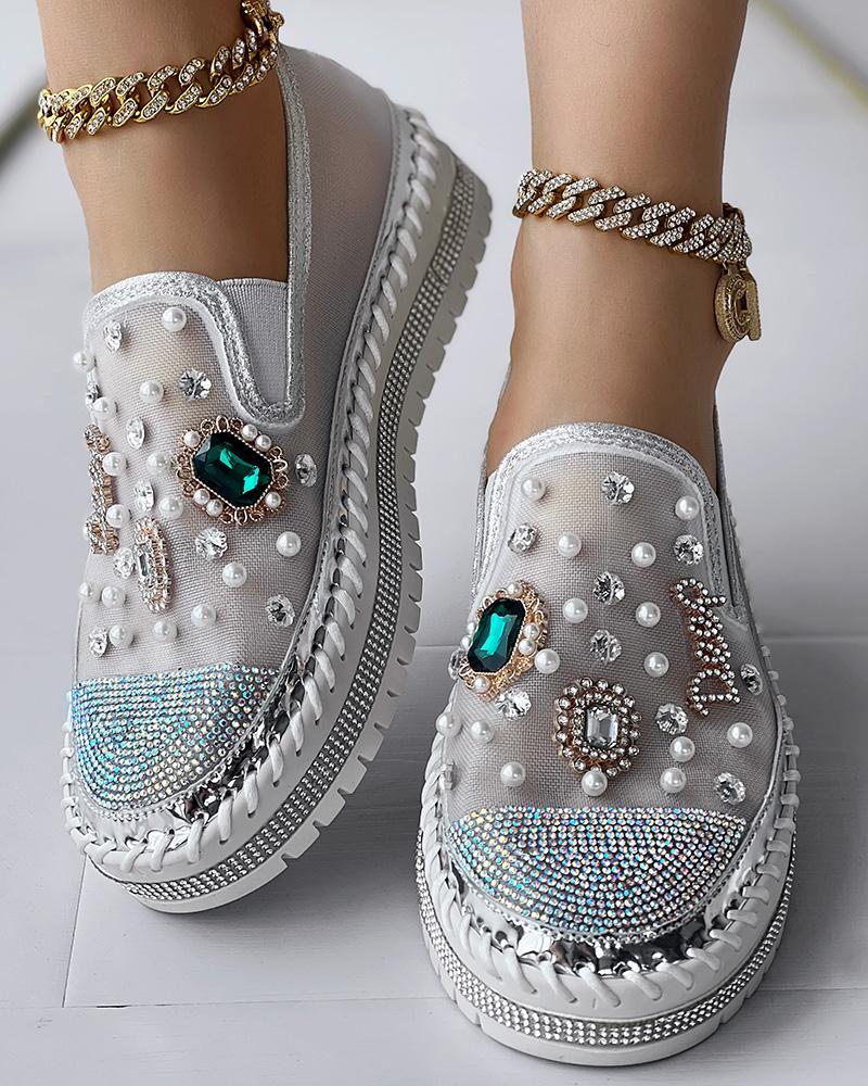 Pearls Rhinestone Decor Muffin Loafers, White