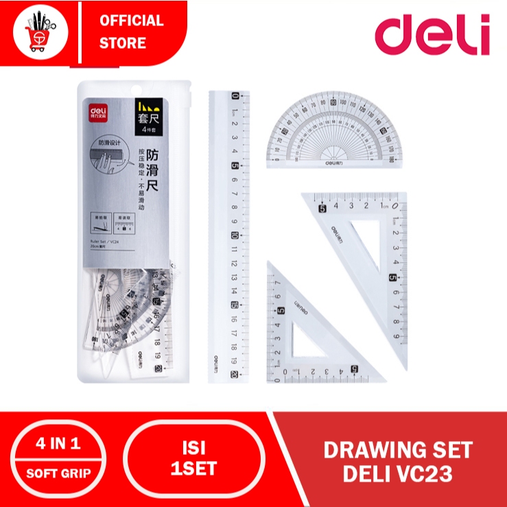 Penggaris | Ruler | Drawing Set DELI VC23 (1SET) SPESIFIKASI : - 1PCS BUSUR 180DERAJAT - 1PCS PENGGARIS SEGITIGA 9CM - 1PCS PENGGARIS SEGITIGA 7CM - 1PCS PENGGARIS 15CM >>> NOTE
