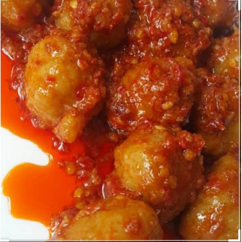 Pentol bakso dengan perpaduan daging ayam dan sapi yang dimasak dengan sambal mercon bikin pengen lagi dan lagi,,